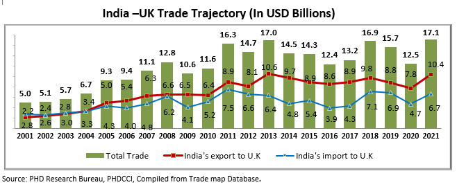 Trade Dynamics- Economic relations between the two countries are dynamic as the society is evolving in consonance with the economic interests and perceptions of the people. India’s trade with the UK has expanded from USD 5 billion in 2001 to USD 17 billion in 2021. India’s exports to UK were around USD 10.4 billion, and imported from UK were USD 6.7 billion.